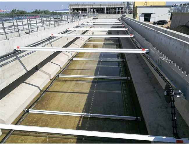 链板式刮泥刮渣机运行时,由链条带动刮板在池中做连续的回转运动,将池底的污泥刮至集泥槽中,并可刮除池面的浮油或浮渣。