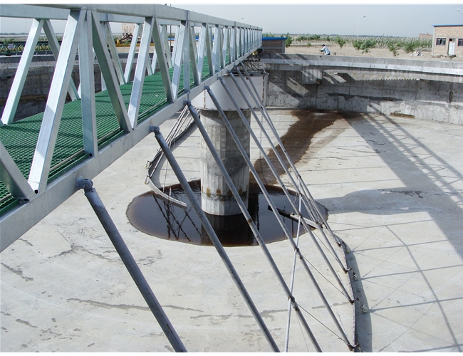 污水从池中心的进水管经导流筒扩散后,均匀地向周边呈辐射状流出,呈悬浮状的污泥经沉淀后沉积于池底,上清液通过溢流堰板由出水槽排出池外,污泥刮板由池周刮向中心集泥槽,依靠池内水压通过排泥管排出池外。主梁在周边驱动装置的带动下,以中心旋转支座为轴心沿池顶以2.0m/min线速度行驶,主梁下部连接支架、污泥刮泥板等。近液面处设置浮渣刮板,沿中心稳流筒延伸至铰链式刮渣耙,当主梁旋转时,浮渣刮板将液面的浮渣由池中心撇向池周,收集在铰链式刮渣耙区内,收集的浮渣随主机在池周运动至撇渣斗,通过刮渣耙的铰链活动刮至撇渣斗内,排至池外。