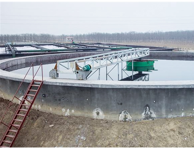 工作桥由安装在周边的驱动机构带动,绕安装在池中心支墩上的中心支座旋转,安装在工作桥上的一组刮泥板在旋转过程中,将沉淀在池底部的污泥刮向池中心的积泥坑。同时,液面上的浮渣在浮渣刮板和周边挡渣堰形成的渐缩区域内集中,有浮渣刮耙扒到集渣斗,排至池外。