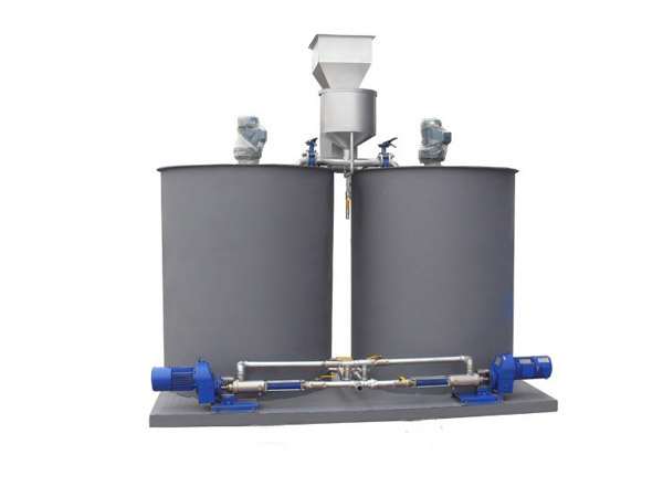 双罐式加药装置安装比较方便,根据现场,将加药装置摆放在合适的位置,距离压滤机近些,将自来水分路接至两个搅拌罐,再把旋切水进水管与自来水主管道连接,螺杆泵出口连接至压滤机污泥搅拌罐或管道混合器。